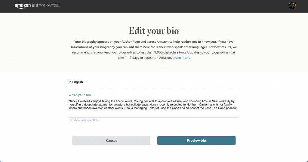 The most important part of your author page is your biography, where you tell readers about yourself. Look for the “Profile” tab and click on the “add bio” button to add your biography. Consider the following: