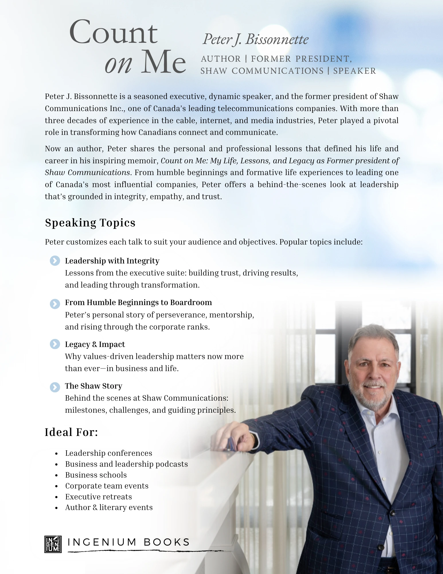 Peter J. Bissonnette retired as president of Canadian telecommunications giant Shaw Communications in 2015. “Count on Me” is Peter’s autobiography, helping him deliver part of his legacy and a lesson for those that can learn from the against-all-odds story that his life reflects.